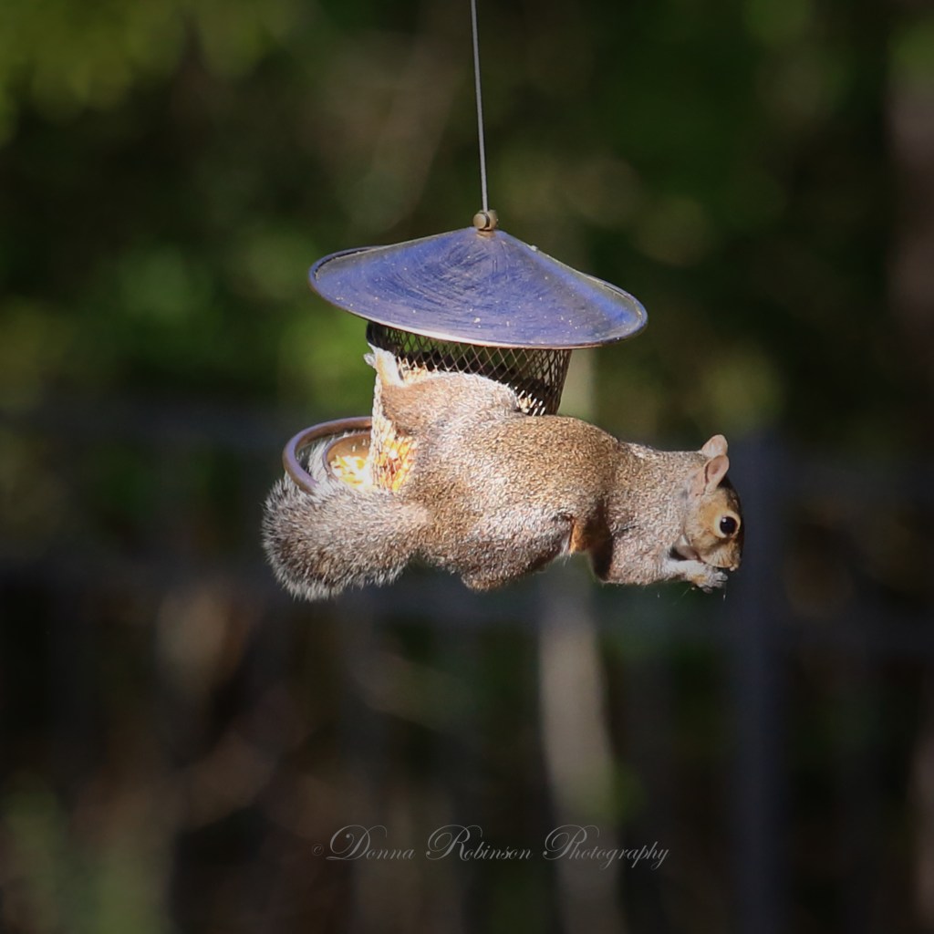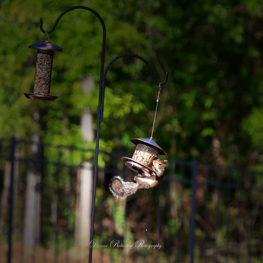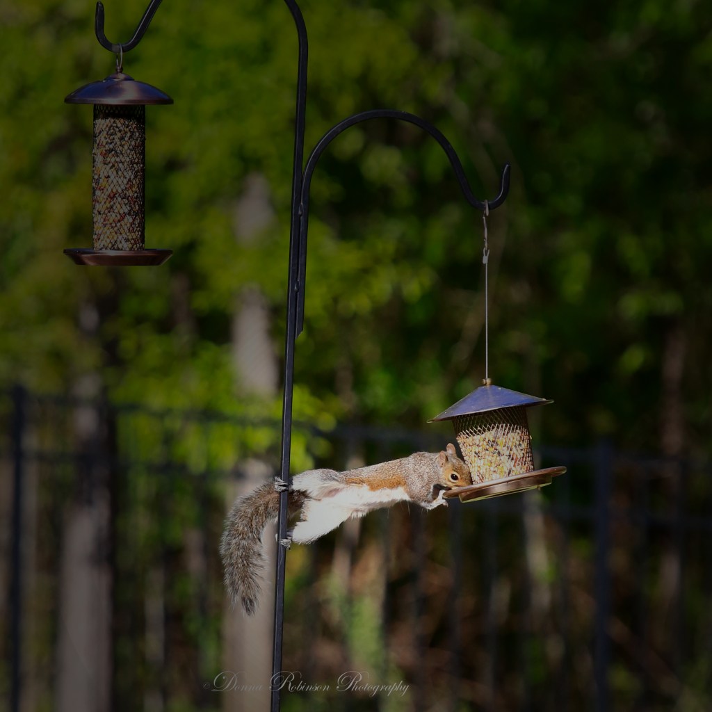 We have a VERY relentless squirrel hanging out around our bird feeders. He’s rather cute to watch as he comes scampering out of the woods across the lawn to the feeders. He even stops to snag a few droppings at the base of the feeders.