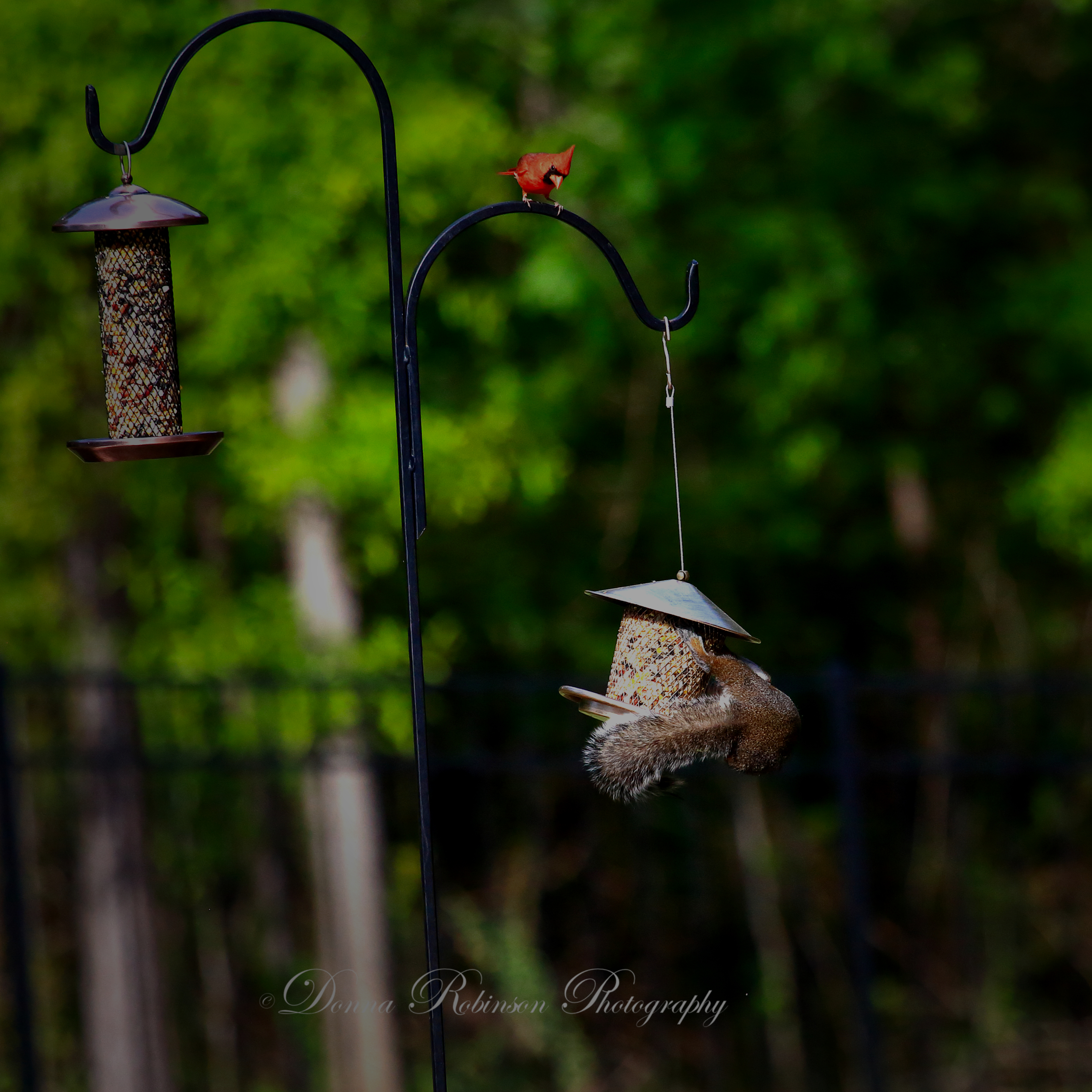 Great captures of this determined squirrel! My favorite is the one with the cardinal. The squirrels in our yard are lazy and feast on the seeds on the ground underneath the feeder.