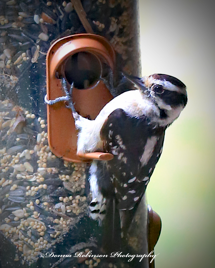 Day 10 – We have a new visitor at the birdfeeder today, an Eastern Female Downy Woodpecker. According to All About Birds “Downy Woodpeckers are small versions of the classic woodpecker body plan. They have a straight, chisel-like bill, blocky head, wide shoulders, and straight-backed posture as they lean away from tree limbs and onto their tail feathers. The bill tends to look smaller for the bird’s size than in other woodpeckers.”