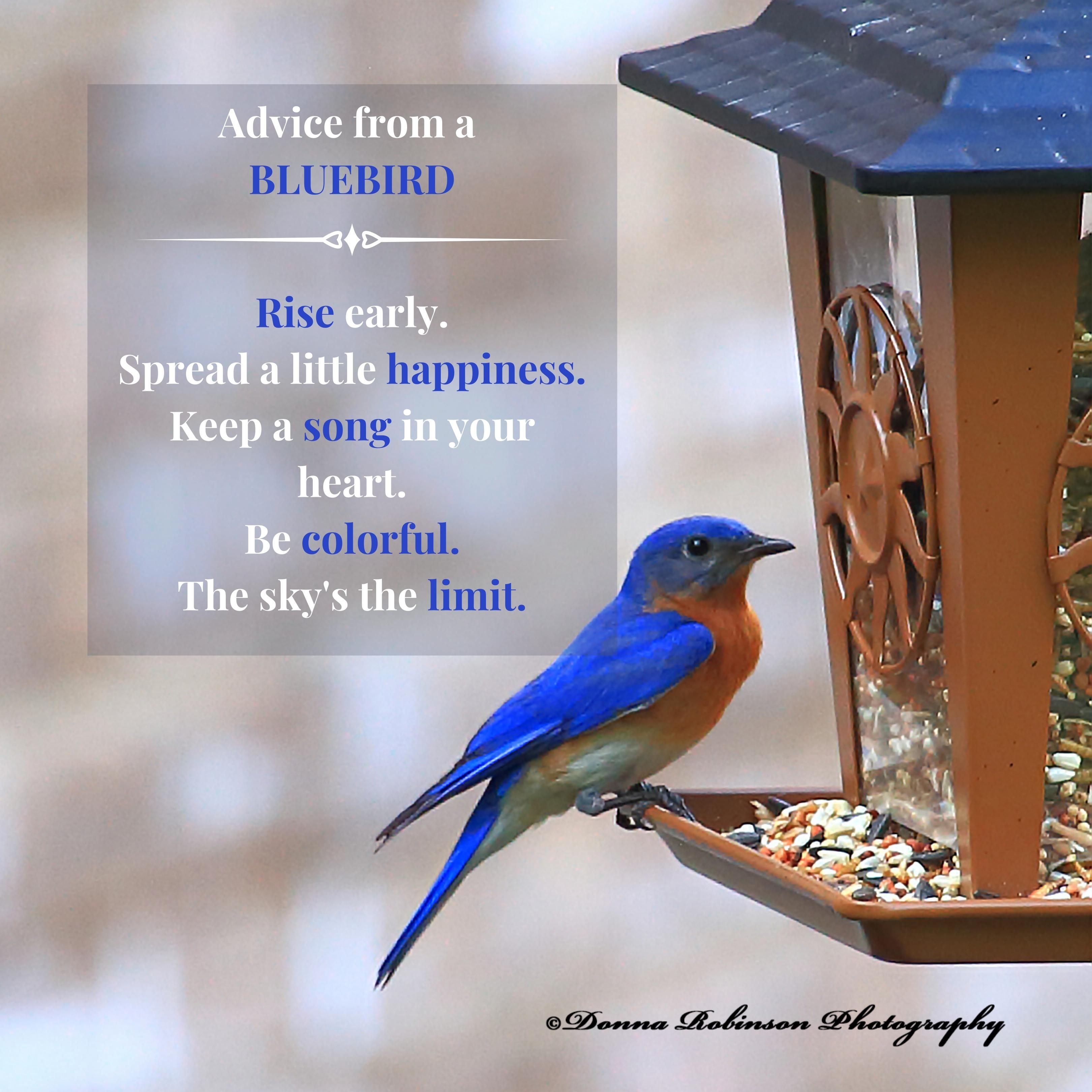When you look at the original photo on the left it needs a lot of cropping to get to the main subject, the bluebird and the feeder (the second photo). I would rather the bird face the other direction, but I had to go with where it landed (trust me I took several shots to get this one). But what I like with the end result is the quote actually anchors/balances the photo. What do you think?