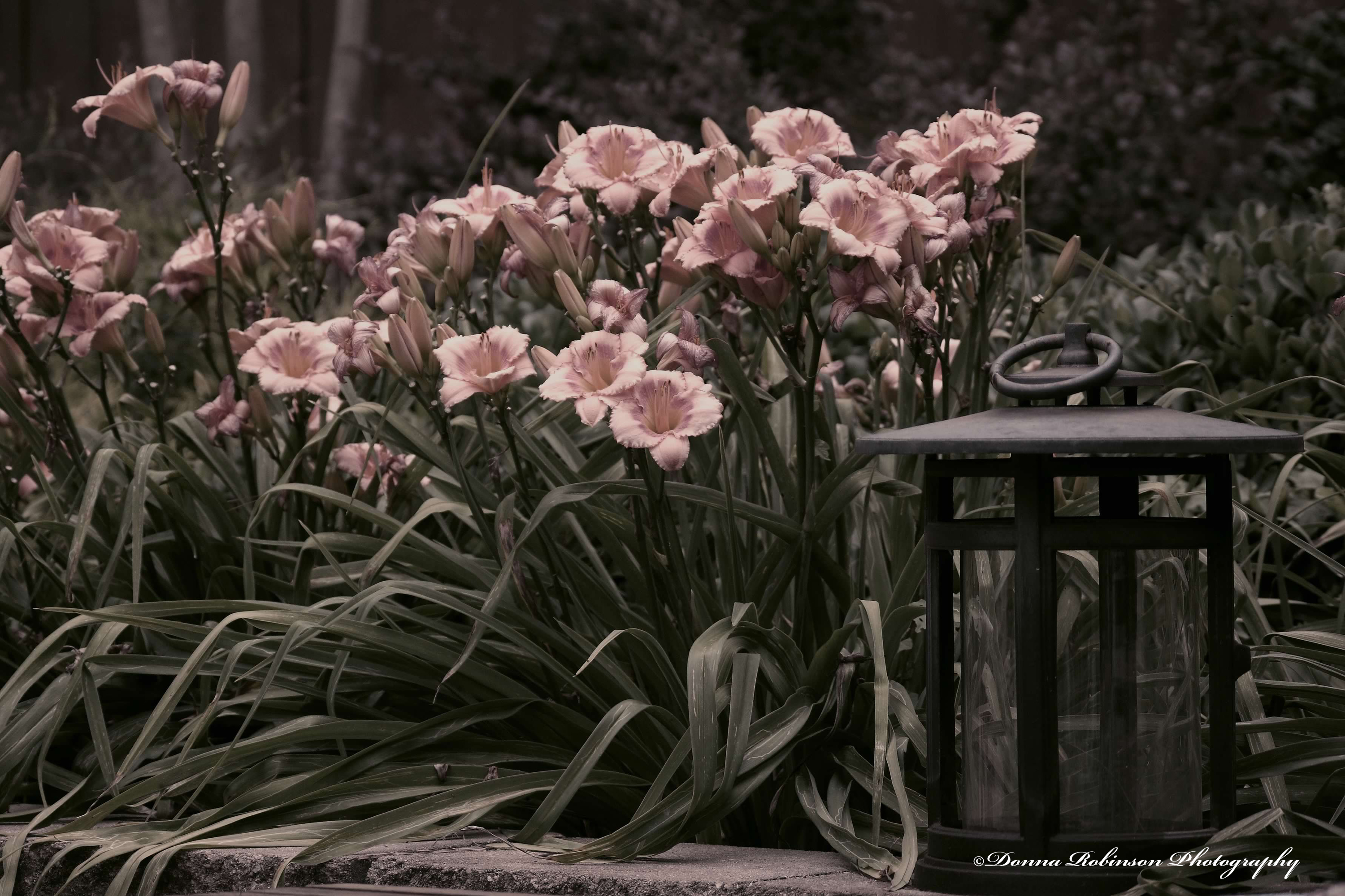 Like these daylilies and black lantern. The daylilies may first catch your eye first, but because they face in the direction of the lantern, it becomes the anchor.