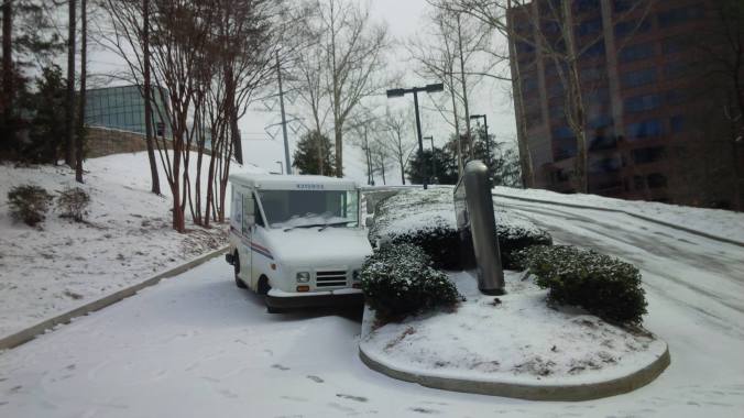 Sometimes, we stumble upon unfortunate, temporary circumstances of abandonment. Take his mail carrier, who abandoned his vehicle in the midst of an unexpected Atlanta ice storm. Looks like he decided to heck with the postman’s motto “Neither snow nor rain nor heat nor gloom of night stays these couriers from the swift completion of their appointed rounds.” But there are still questions like “Where did he go?” “What happened to the mail left unattended?” I guess I can’t blame this postal carrier too much. Ice in Atlanta is not a force to be messed with.